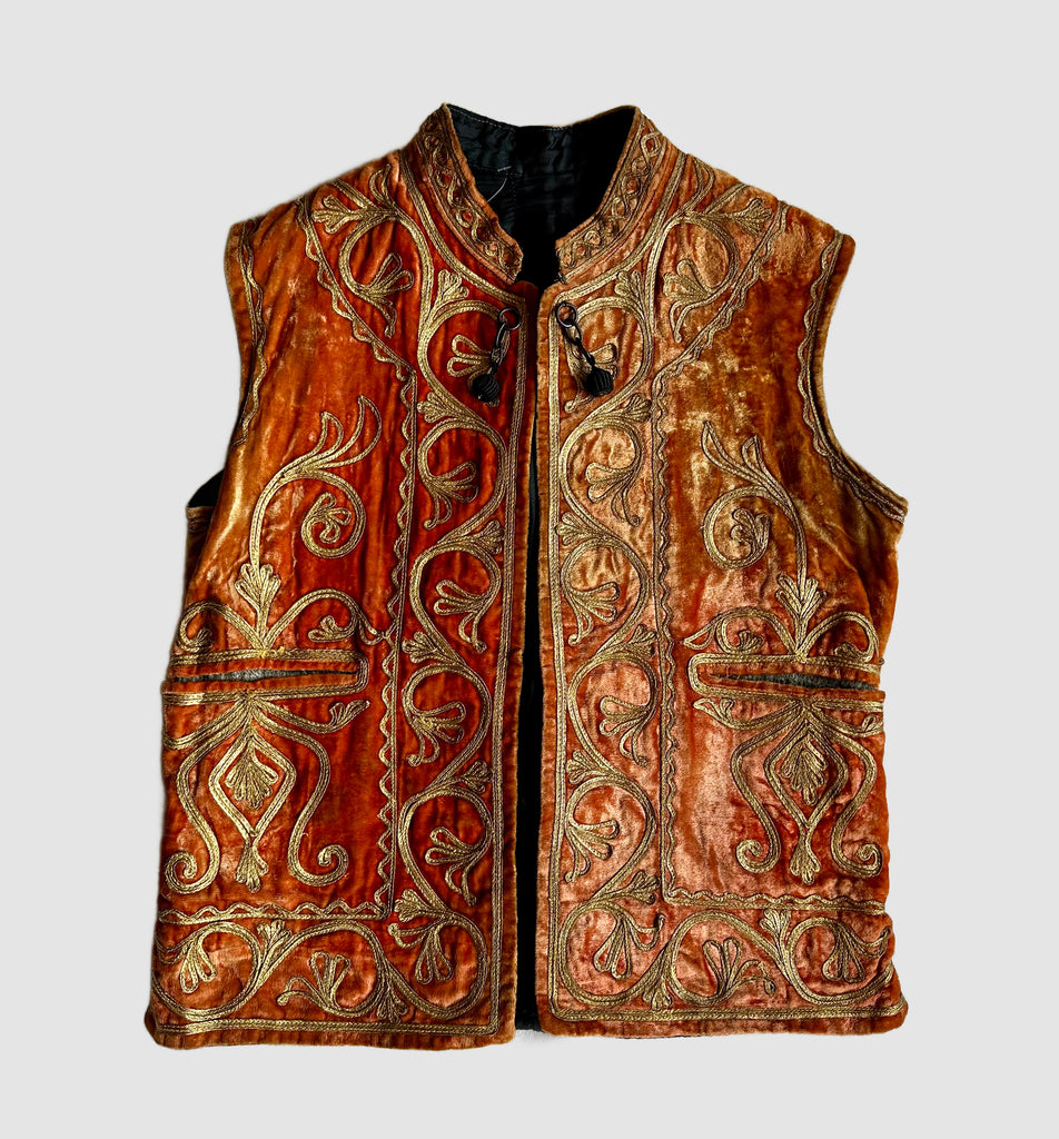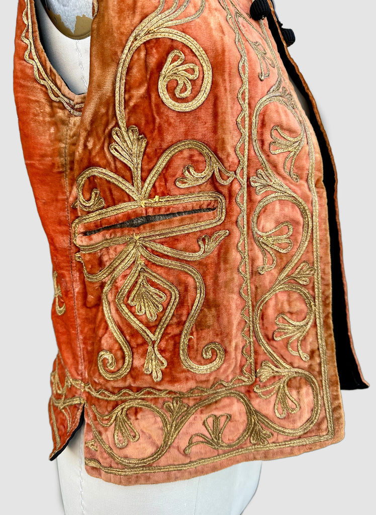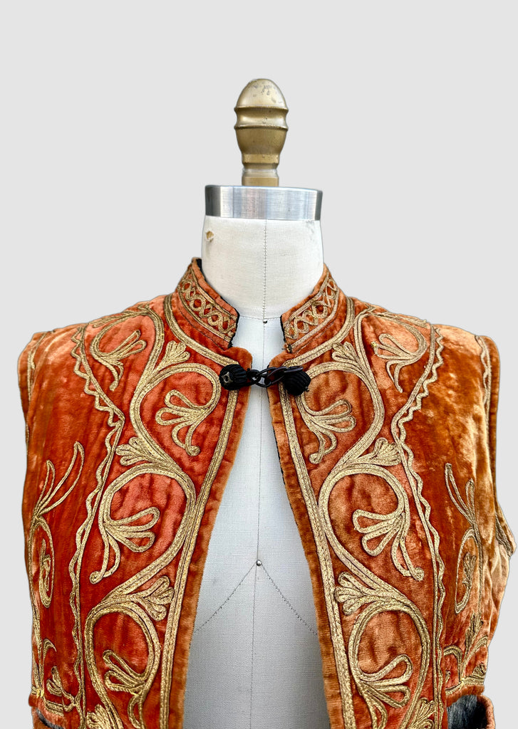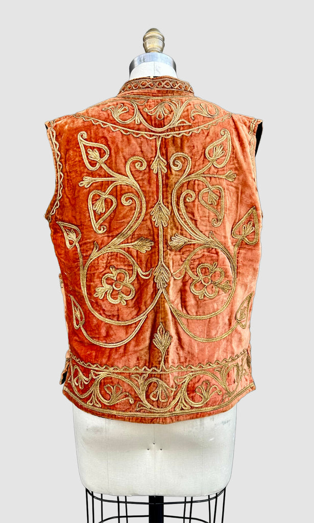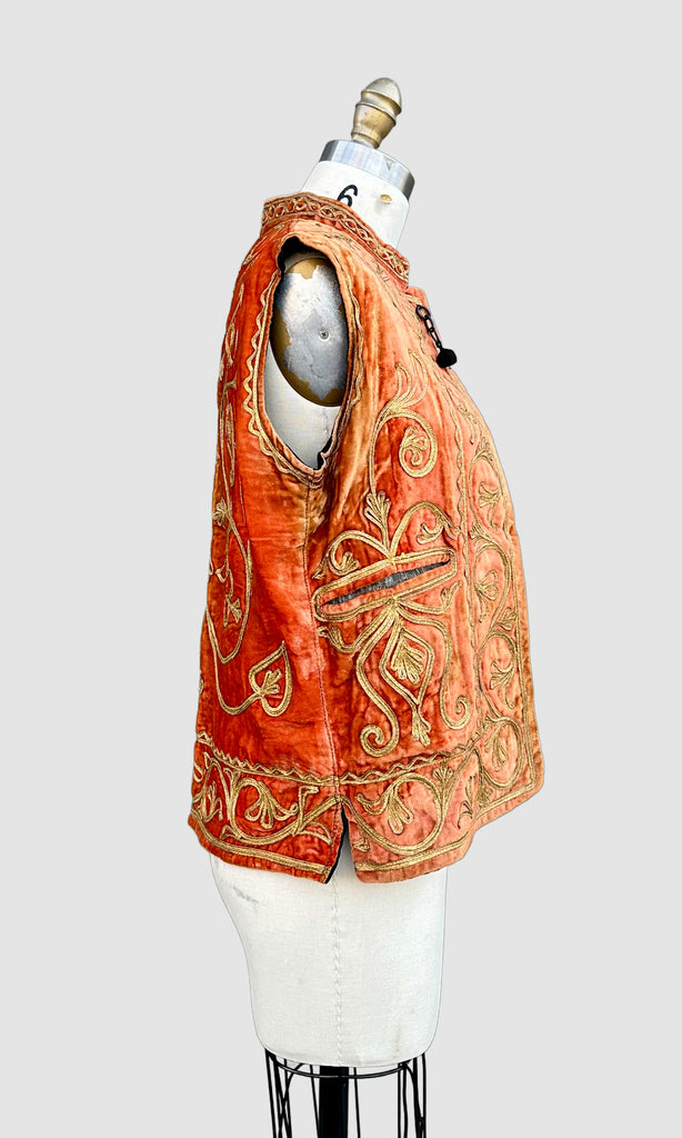 Gorgeous Afghan vest from late 1940's, early 50's that has hand done applique work, made in Afghanistan. This piece features wonderful handmade details all throughout the vest. The base material is a rich orange velvet, with touches of gold that shimmer in the light. All the rope/applique details shine in a lovely gold colors. There are two small ties at the top with 3 chain link pieces and tassel balls at the end for a slight closure. Meant to be worn open or tied at the top neckline. Also two medium sized pockets on the front with gray lining. Black nylon lining inside. Such a unique Afghan vest!