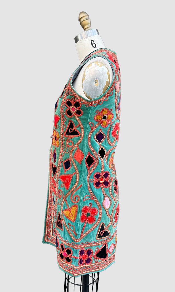 Stunning Afghan vest from the 1960's that has hand done applique work, made in Afghanistan. This piece features wonderful handmade details all throughout the vest. The base material is velour in a lovely teal color, with orange, red, pink and purple floral patterns. This piece is longer and runs past down the hips. There are four ball and loop closures in the front of the vest. Light blue breathable linen lining. Such a gorgeous Afghan vest!