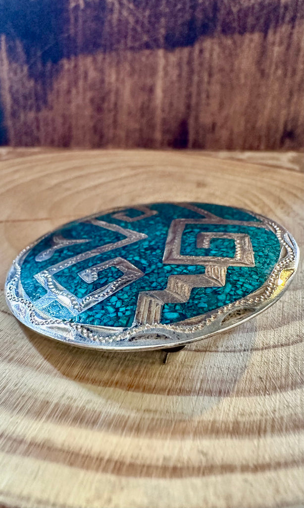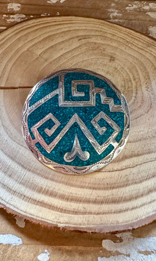 Super cool Mexican vintage turquoise inlay and sterling silver brooch and pendant. Features small fragments of turquoise inlay, along with intricate Aztec stamp details. A great southwestern accessory. Mexican made in Guadalajara Mexico, hallmark on the inside. Can be worn as a pendant with a loop secured on the back or as a brooch with a rolling clasp closure. Such an amazing piece.