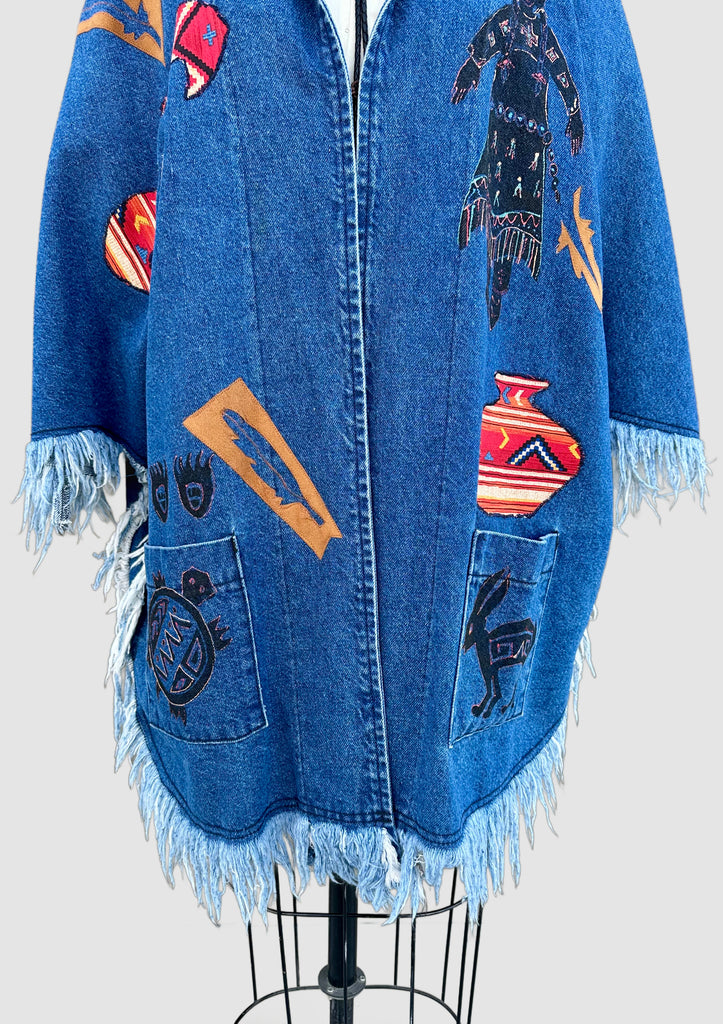 Blue denim poncho style jacket by the label, Sundance. 100% cotton, made in the USA. Washed denim fringe all along the bottom hem and sleeves. This awesome piece has native style applique in leather and fabric added to the front and back. There is one wire hook clasp on the front for closure and 2 pockets on the front. Can be worn oversized, this is not a traditional poncho because the there are seams at the sleeves.
