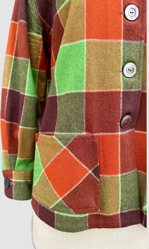 Gorgeous western plaid button up shirt by the label, Western Star, made in seattle. This style of shirt is also called a 49er due to the year they were made in 1949. Features a pointed collar, darting on the shoulders, 2 large pockets on the front, and nice large round buttons on the sleeves and front for closure. The bright greens, orange and brown colors are so complementary, nothing quite like this color combo. Even better in person!